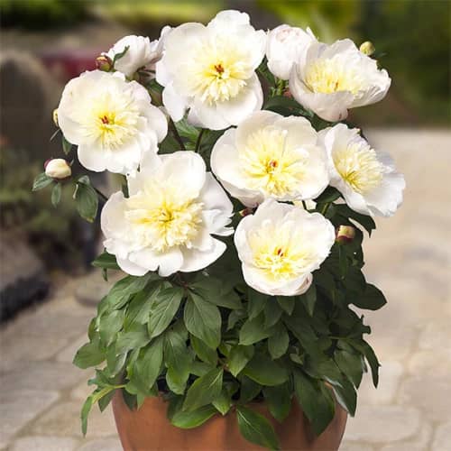 Тувакдаги пионлар кўпинча оптимал парвариш шароитлари ва сояга ёки қуёшга ўтиш қобилияти туфайли узоқроқ гуллаш даврига ега.